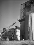 Razing buildings; Demolition; Demolished buildings; Cranes (Machinery); Hoisting machinery; Grain elevators; Burrus Mills; Light Crust Doughboys; Debris; Burrus Mill and Elevator Company
