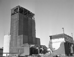 Razing of Burrus Mills. Concrete and brick grain elevators being knocked down next to a brick warehouse or office building also being knocked down. The rebar reinforcement in the exposed edges of concrete is sticking out. This view of the upper level of the elevator building appears to be lumber such as long 2x4 planks that are pegged or screwed onto the superstructure inside. There are long ladders attached to the walls, made of 2x4s uprights and short 2x4 cross members. The foreground is strewn with piles of bricks and railroad ties. Burrus Mill and Elevator Company was the maker of Light Crust Flour and the sponsor of the radio program that featured the western swing group called The Light Crust Doughboys.