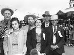 In charge of the parade were, left to right, Charlie Featherston, Wichita Falls, Texas; Mrs. Fred Anderson, John R. Shipley, Mrs. Boyce Kenady, C. L. Anderson, and Don Griffith, all of Floydada, Texas. The group is standing close together. Mr. Featherston is wearing a cowboy hat, shiny western shirt, and a striped tie. Mrs. Anderson is a dress with a coat. She has a scarf around her neck. Mr. Shipley is standing behind the two women. He's wearing a cowboy hat. His eyes are closed. Mrs. Kenady is wearing a hat with stripes, a dress, and coat. There is a piece of paper pinned to her coat. Mr. Anderson is wearing a cowboy hat. He has a neatly trimmed beard. Mr. Griffith is wearing a hat and suit. His hands are folded in front of him. The is a piece of paper pinned to his suit. There are unidentified people behind the group. Star-Telegram Morning Edition June 3, 1940