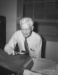 Charles P. Williams, white-haired project engineer at Possum Kingdom, has been building dams in the United States and Mexico for exactly half a century. He's shown looking over a blue print with a magnifying glass. He has been in the business of dam construction and hydraulic design for a long time that he calls himself "The Beaver". Published in the Fort Worth Star-Telegram morning edition, June 24, 1940.