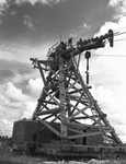 A wooden giant crane used in building at Possum Kingdom Dam. There are two men working on the top of the crane. The project engineer is Charles P. Williams who has been building dams in the United States and Mexico for exactly half a century. Published in the Fort Worth Star-Telegram morning edition, June 24, 1940.