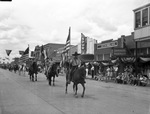 Spur Roundup and rodeo. Beginning of the parade, with George Bradley Leading. Bradley is seen in the front of the line riding his horse and holding the United States flags, as the others behind him follow.