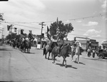 Spur Roundup and rodeo. Parade shot. Seen are men riding their horses and holding a flag as they ride down the street.