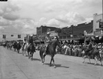 Spur Roundup and rodeo. Section of the parade showing cowgirl sponsors. Seen in the middle of the line are cowgirls riding their horses, as people look on.