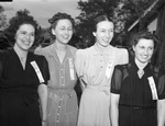 Spur Roundup and rodeo. Left to right, Mrs. C. L. Harris, Mrs. L. E. Standefer, Mrs. J. C. McNeil III and Mrs. Ty Allen, seen standing side by side wearing dresses with a ribbon reading Hostess.