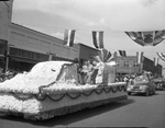 National Tomato Show and Festival at Jacksonville. Miss Carthage, seen sitting on a float, in front of a line of cars.