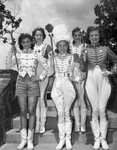 National Tomato Show and Festival at Jacksonville. Rock Mound Band, left to right, Barbara Jean Stadek, Bobbie Faye Wallace, Jimmie Lou Coleman, Kathlynn Reaves, Carolan Mallard, seen standing on steps outside.