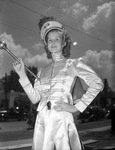 National Tomato Show and Festival at Jacksonville. Dorothy Lanier, drum major of Rusk High School band, seen holding up her baton with one hand and holding her waist with the other.