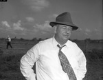Texas Hereford Association Tour. Horace High of High, registered Hereford breeder, seen standing outside in a button down shirt, hat, and tie.