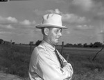 Texas Hereford Association Tour. G. W. Payne, Hereford Breeder, Saltillo, seen outside with his arms crossed wearing, and button down shirt, tie, and hat.