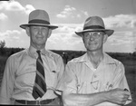Texas Hereford Association Tour. Left to right, L. L. Mackey, and W. R. Owings Junior, both of Longview, seen outside standing side by side wearing a button down and hat.