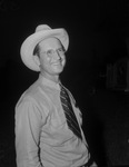 Texas Hereford Association Tour. Howard Hampton, registered Hereford breeder at Clarksville, seen standing outside wearing a hat, tie , and button down shirt.
