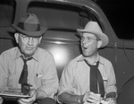 Texas Hereford Association Tour. Left to right, W. T. Montgomery, of San Antonio, Texas, and John Murrin, Fort Worth breeder, seen sitting down in front of a car enjoying a meal.