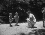 While strolling in Forest Park recently, W. P. Privette, right, of Austin, Texas, stopped to snap a picture of his son, Richard, and Bette Barnhill. Pictures such as this may be submitted in The Star-Telegram Father's Day picture contest. Winners will be published in the Pictorial Section of the newspaper. Mr. Privette is wearing light-colored cuffed slacks, a light short-sleeve shirt, oxford style shoes and eyeglasses. He is crouching as he holds a portable bellows film camera to photograph the two small children in front of him. Bette is wearing an apron-style sleeveless sundress, carrying a knit purse, and is wearing a ruffled sunbonnet. She is holding Richard's hand, who is wearing an outfit in which the short pants are buttoned to the shirt. The boy's shirt is short sleeved with puff sleeves and a lacy neckline. The photo is taken on a wooded gravel path next to a fence post.