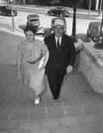 Shown here are early arrivals at the Texas Press Association (TPA) convention at Mineral Wells, Texas. They are Mr. and Mrs. Sam Fore Junior of Floresville, Texas. They have missed only one TPA convention in 25 years. They are outside, walking up a set of stairs. Mrs. Fore is wearing a striped dress belted at the waist and is holding a handbag in her left hand. Mr. Fore is wearing a dark colored suit, hat and eyeglasses and is smoking a cigar. There are automobiles on the road in the background.