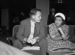 Shown here are early arrivals at the Texas Press Association (TPA) convention at Mineral Wells, Texas. They are Roy L. Swift, left, editor of the Robstown Record, and Bess Stephenson. They are sitting on a couch. Mr. Swift is wearing a suit and striped necktie. Miss Stephenson is wearing a floral print dress and is holding a rolled piece of paper.