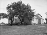 The brick home of Ted R. Frost, oil company executive, in Weatherford, Texas. The front of the house has a small stairway leading up to a porch. On the porch are two lawn chairs. In the front lawn are three large, tall trees. In the background at the far right is a Aermotor Company windmill.