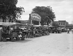 A row of fruit stands on the court house lawn in Weatherford, Texas. The stands are being manned by several men and women. A sign above one of the stands reads, "Weatherford Parker County Texas Fruit & Melon Center." In the background at the right are other businesses and buildings, including Renfro's Drug Store and Ben Franklin Stores.
