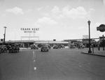 The new Frank Kent Motor Company, on the corner of South Main Street and Lancaster Avenue in downtown Fort Worth, Texas. Several automobiles are on the road. Some can be seen driving under a bridge in the background, at the far right.