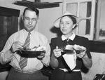 Shown eating barbecue during festivities of the National Range Tour, which covered 14 West Texas counties, are B. F. Vance, assistant administrative officer of the Triple-A at College Station, Texas, and Mrs. E. N. Holmgreen, wife of Administrative Officer Holmgreen. They are each holding a plate of food. Mr. Vance is wearing a long-sleeve, button-down shirt. a striped necktie, trousers and eyeglasses. Mrs. Holmgreen is wearing a dress with a belt at the waist and a hat. She has a brooch pinned to her dress at the base of the collar. She is wearing a wrist watch on her left wrist.