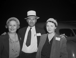 Hundreds of West Texans took part in greeting and entertaining the cattlemen and Department of Agriculture experts and officials on the National Range Tour through 14 West Texas counties. Among those who greeted the officials were, left to right, Mrs. Hal Peck, Mr. Peck and Mrs. Roy Parks, all of of Midland, Texas. Mrs. Peck is wearing a dress, coat and a hat. Mr. Peck is wearing a suit and a boater hat. He has his arms around his wife and Mrs. Parks and is holding a cigar in his left hand. Mrs. Parks is wearing a dress, coat and a hat.