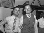 Hundreds of West Texans took part in greeting and entertaining the cattlemen and Department of Agriculture experts and officials on the National Range tour through 14 West Texas counties. Among those who greeted the officials were, left to right, Lee R. Pool, of Kermit, Texas, and John L. Mogford, of Monahans, Texas, both farm agents of the Agricultural and Mechanical Extension Service. Mr. Pool is wearing a striped, long-sleeve button-down shirt and a striped necktie. Mr. Mogford is wearing a vest layered over a striped, long-sleeve button-down shirt and a striped necktie. Both men are smiling.