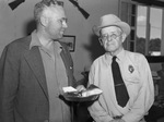 Hundreds of West Texans took part in greeting and entertaining the cattlemen and Department of Agriculture experts and officials on the National Range tour through 14 West Texas counties. Among those involved in the tour were, left to right, R. M. Evans, of Washington, D. C., administrator of the Agricultural Adjustment Administration, and C. O. Finley, rancher at Pecos, Texas. Mr. Evans is wearing a collared button-down shirt, a sport coat and eyeglasses. He is holding a plate of food in his left hand. Mr. Finley is wearing a long-sleeve collared shirt, a necktie, a cowboy hat and eyeglasses. A badge is pinned to his shirt above the front pocket.