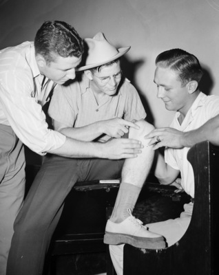 Texas Christian University football player Kyle Gillespie, junior quarterback, showing his knee operation to captain Clarence Alexander, left and Connie Sparks, right. The players are all wearing short-sleeved shirts and long pants while Mr. Gillespie is also wearing glasses, a cowboy hat, socks pulled up to his calf, and raised shoes. Mr. Gillespie has his left pant leg pulled p past his knee and is pointing to a scar on that knee. Mr. Alexander and Mr. Sparks have their hands on the knee and our looking at the scar. Star-Telegram Evening, September 5 1940.