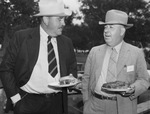 Among the men who made the National Range Tour through West Texas were, left to right, Donald Hutt, Midland, Texas, rancher, and Henry Bell, of Fort Worth, Texas, manager of the Texas and Southwestern Cattle Raisers Association. Both men are wearing hats and suits. They are standing outdoors, each holding a plate of food.