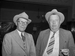 Among the men who made the National Range Tour through West Texas were, left to right, John Conrad, Borden County, Texas, rancher, and Price Maddox, who ranches near Maryneal, Texas. Mr. Conrad is wearing a three-piece suit, a cowboy hat and eyeglasses. Mr. Maddox is wearing a suit with a striped necktie and a cowboy hat. He is holding a cigar in his left hand.