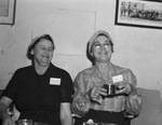 The National Range Tour, which visited West Texas ranges, ended with a business session and conference on future range programs of the United States. Among those who made the tour through Texas were, left to right, Mrs. Howard Kingsbery, of Santa Anna, Texas, left, and Mrs. Jesse H. Watson, of Newcastle, Texas. Their husbands are both state committeemen. They are sitting on a couch. Mrs. Kingsbery is wearing a short-sleeve polka-dot dress and a hat. Mrs. Watson is wearing a striped long-sleeve blouse, a skirt, a hair wrap and eyeglasses. She is holding a mug. Both women have name tags pinned to their clothing. They are both smiling.
