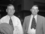 Two of the cattlemen who assembled at Midland, Texas, for the three-day session of the National Range Conference were, left to right, Bruce Hendricks, of Pawhuska, Oklahoma, and J. R. Trout, of Terral, Oklahoma. Mr. Hendricks is wearing a long-sleeve collared shirt, necktie and eyeglasses. He is holding a hat. Mr. Trout is wearing a suit with a pinstripe collared shirt. He is looking off to the right.