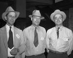 Three of the cattlemen who assembled at Midland, Texas, for the three-day session of the National Range Conference were, left to right, Roy Richerson, county agent at Waurika, Oklahoma, Fred Ahrberg, county agent at Pawhuska, Oklahoma, and V. G. Young, of Midland, Texas. Mr. Richerson is wearing a suit and a hat. He is holding a cigarette in his left hand. Mr. Ahrberg is wearing a long-sleeve collared shirt, necktie, trousers and a hat. Mr. Young is wearing a striped collared shirt, necktie, trousers, a hat and eyeglasses.