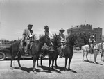 Members of the 1940 National Range Tour visited ranges and ranch homes in Texas June 24-28, 1940. Among those who made the tour through Texas were, mounted on horses, left to right, Grove C. Hill, George H. Slaughter, assistant, Texas committeeman secretary of agriculture, and I. W. Duggan, director of the Southern Division of the Department of Agriculture, Washington, D. C. All three men are wearing suits and hats and are holding lassos. An unidentified man on a horse is at the far right. In the background, at right, are several trees and a building.