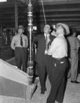 In attendance at the Permian Basin Association convention at Odessa, Texas, were P. O. Sill, Midland, Texas, drilling contractor, left, R. E. O'Donnell, center, division superintendent for West Texas and New Mexico of the Halliburton Company, and R. T. German, right, of Odessa, Texas, Magnolia Petroleum Company superintendent. O'Donnell is explaining a new tool to German. Sill is wearing a long-sleeve collared shirt, necktie, pinstripe trousers and a hat. O'Donnell is wearing a suit and eyeglasses. German is wearing a long-sleeve collared shirt, trousers and a hat.