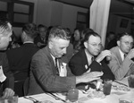 Among those attending the Permian Basin Association Convention at Odessa, Texas, was A. B. Davis, left, manager of the Lubbock Chamber of Commerce, who aided in the landing of the 1941 convention for his city. He is shown at the convention's concluding banquet, sitting at a dining table. He is wearing a suit and holding a salt shaker. Seated to the right are two unidentified men wearing suits and eyeglasses.