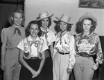 The Slaton, Texas, rodeo was held June 28 and 29, 1940. Among those who attended the rodeo were, left to right, Lilyan Bickerstaff, of Sweetwater, Texas, Wanda Fae Wyatt, of Fort Worth, Texas, Maxine Edom, of Slaton, Texas, Mildred Coleman, of Fort Worth, Texas, and Mary Helen Stuart, also of Fort Worth, Texas. Miss Bickerstaff is wearing a short-sleeve, collared blouse and trousers. Miss Wyatt is wearing a short-sleeve, collared blouse, a vest and a skirt. Miss Edom is wearing a short-sleeve, collared blouse, a skirt and a cowboy hat. Miss Coleman and Miss Stuart are wearing long-sleeve blouses, trousers and cowboy hats.