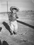 Preparing for the 11th annual Pecos, Texas, rodeo is two-year-old Mickey Bowser, grandson of Captain M. L. Swinehart. Swinehart is manager of the Pecos Chamber of Commerce. Mickey is standing in the middle of a road. He is wearing a long-sleeve shirt, a bandanna around his neck, trousers, a cowboy hat and cowboy boots.