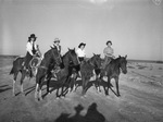 Preparing for the 11th annual Pecos, Texas, rodeo are, left to right, Joan Stokes, Mrs. Norman Eisenwine, Mrs. Whit Waide and Mrs. Katherine Braughton. They are mounted on horses. Miss Stokes is wearing a long-sleeve blouse, a necktie, trousers, cowboy boots and a cowboy hat. Mrs. Eisenwine is wearing a long-sleeve blouse, a vest, trousers and a cowboy hat. Mrs. Waide is wearing a short-sleeve blouse, trousers and a cowboy hat. Mrs. Braughton is wearing a plaid print blouse, trousers and cowboy boots.