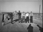 Rodeo officials preparing for the annual Pecos, Texas, rodeo are, left to right, Elmer Harrington, rodeo committee chairman, Vestal Lott, advertising and publicity, Harry Clinton, gate and tickets, and Robert Ball, secretary. At the far left is a horse. All four men are wearing long-sleeve, button-down shirts, trousers and neckties. Harrington, Lott and Clinton are wearing cowboy hats.