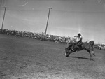 The Slaton, Texas, rodeo was held June 28 and 29, 1940. H. Woolverton is shown just barely staying on the horse during a bronco riding contest. He is wearing a long-sleeve shirt, trousers and a cowboy hat. Spectators are sitting in the background, watching the event.