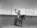 Lois Nance, of Justiceburg, Texas, was one of the out-of-town sponsors for the Slaton, Texas, rodeo, held June 28 and 29, 1940. She is shown riding a horse. She is wearing a long-sleeve blouse, a vest, trousers and cowboy boots. She is holding a cowboy hat in her right hand.