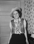 Miss Nadine Smith, of Slaton, Texas, was one of the attendees of the 1940 Slaton Rodeo. She is standing in front of a closed door, wearing a short-sleeve blouse, a bandanna, a vest, a skirt and a cowboy hat. She is smiling.