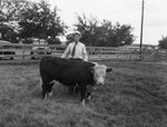 When J. N. Edens Senior entertained the farm club boys of Navarro County at the Fair grounds in Corsicana, the Hereford enthusiast and his son accompanied the Chuck Wagon Gossiper out to the Eden ranch where these pictures were made. In this picture is J. N. Edens Senior exhibits his bull calf Eden's Publican Domino 2nd, that was sired by Publican Domino 44th. This calf will be exhibited at the Corsicana Fair, September 24-28. In the background is a fence, trees, and two automobiles. Published in the Fort Worth Star-Telegram morning edition, August 10, 1940.