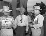 Stamford Cowboy Reunion. Left to right, Mike Murray of Fort Worth, with back to Camera, greeting Leslie McAdam of Crowell while Ed Baty looks on.