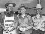 Taking part in the Levelland, Texas, rodeo, celebrating the town's 15th birthday, were Homer Johnson, Tom Gordon and Weldon Dendy. All three are wearing collared shirts, trousers and cowboy hats. Johnson is wearing a bandanna around his neck and an apron. The apron is advertising Higginbotham-Bartlett Company.