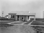 The residence of Burnett Roberts in Levelland, Texas. A bicycle is on the front porch. On the lawn is a child's miniature car. Telephone poles and lines can be seen in the background.