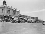 Shot of a busy street in Levelland, Texas. Along both sides of the road are several vehicles. Also shown is a traffic signal with a "No U Turn" sign beneath it. Along the far left are people standing outside of various businesses and buildings, including Wallace Theater, Palace Drugstore and Jones Dry Goods, Incorporated.