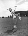 Betty Jo Ratliff, 15-year-old daughter of Mr. and Mrs. W. M. Ratliff, is a champion baton twirler. She is a senior at Odessa High School and was the first prize winner in the first division for baton twirlers in the national contest at Waco, Texas. She is standing in a field, wearing a majorette uniform and boots and is holding a baton. Her body is turned to the right but she is facing the camera. Her right leg is bent at the knee and in the air. In the background are bleachers.