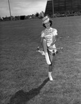 Betty Jo Ratliff, 15-year-old daughter of Mr. and Mrs. W. M. Ratliff, is a champion baton twirler. She is a senior at Odessa High School and was the first prize winner in the first division for baton twirlers in the national contest at Waco, Texas. She is standing in a field, wearing a majorette uniform and boots and is holding a baton. Her right leg is bent at the knee and in the air. In the background are bleachers.